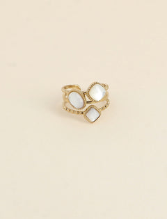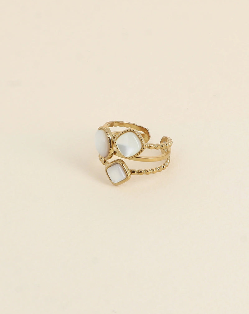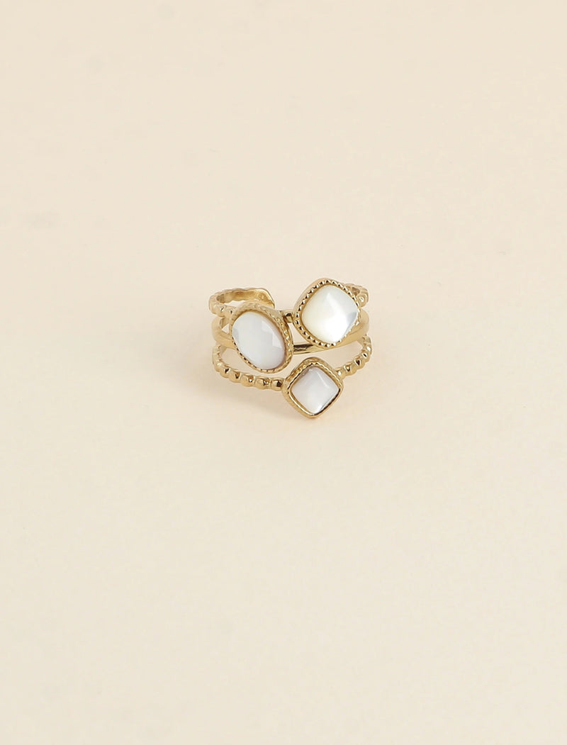Bague en acier inoxydable composée de 3 anneaux effet milgrain et de 3 pierres naturelles carrées et ovale.