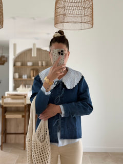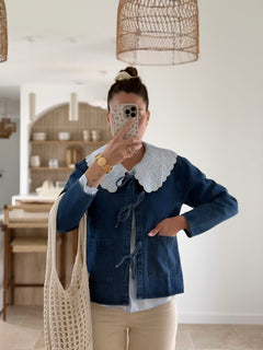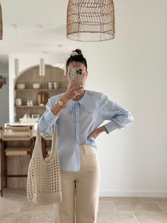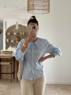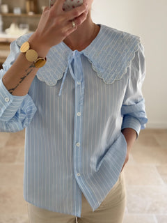 La chemise Celeste est bleu clair rayé tout en douceur, elle séduit par son grand col Claudine brodé de blanc, véritable pièce maîtresse du design. Sur le devant, un délicat lacet vient souligner l’encolure et ajouter une touche vintage subtile. Légère et féminine