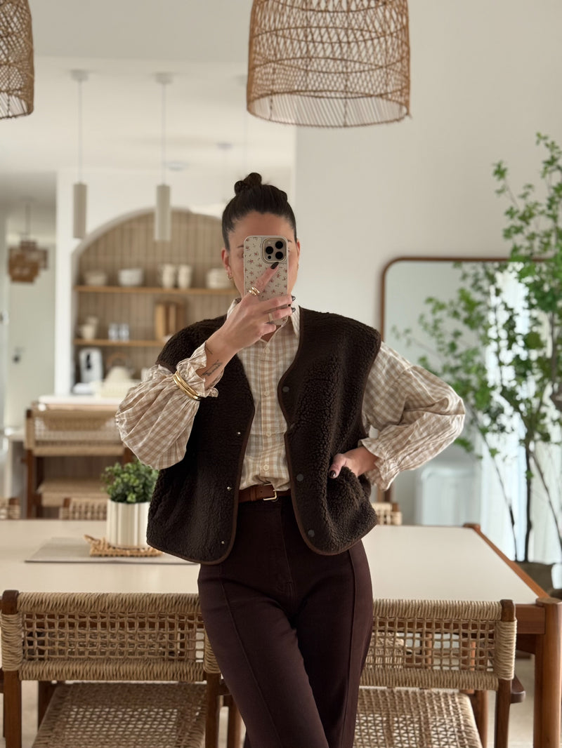 Son coloris brun profond apporte une élégance naturelle et se marie facilement avec des tons clairs comme foncés. Sa coupe droite légèrement ample permet de le superposer aisément sur une chemise, un pull fin ou même une robe.