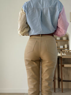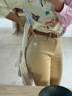 Le jean « Fiore »marron clair est une ode à la douceur et à la simplicité. Sa coupe flatteuse taille haute est sublimée par une petite fleur blanche brodée sur la poche, apportant une touche romantique discrète et originale.