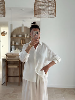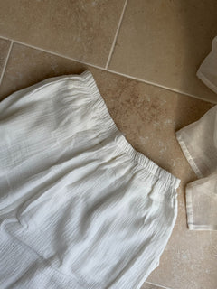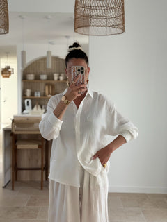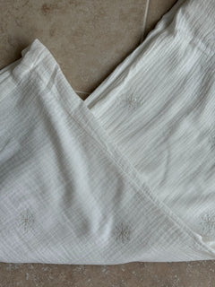 Le Pantalon Liberta est un hymne à la légèreté et au confort. Confectionné en double gaze de coton ultra douce, il présente une coupe ample et fluide, une taille élastique qui s’adapte parfaitement à votre silhouette, et de délicates broderies ton sur ton en forme d’étoiles solaires qui apportent une touche de poésie discrète.