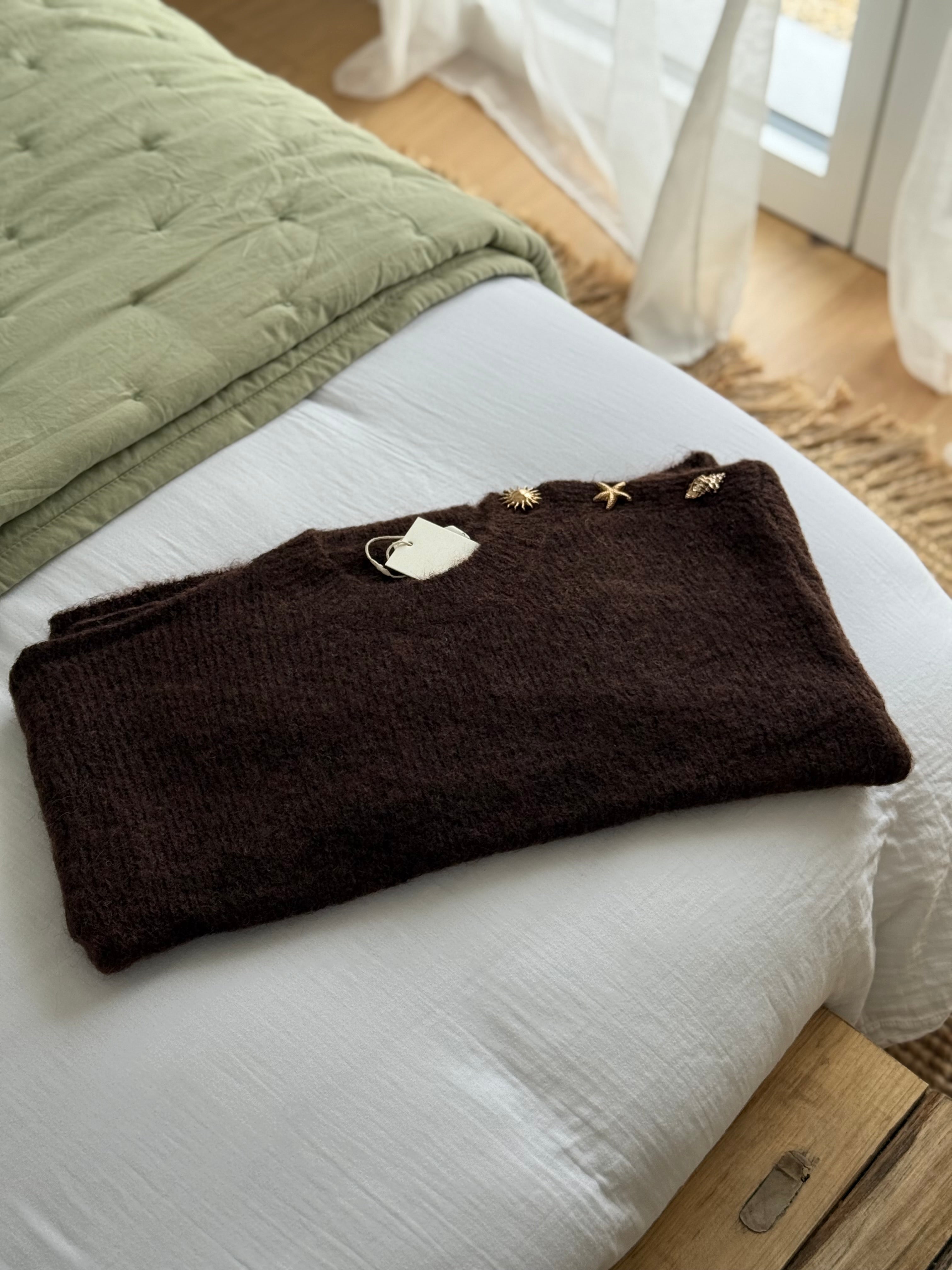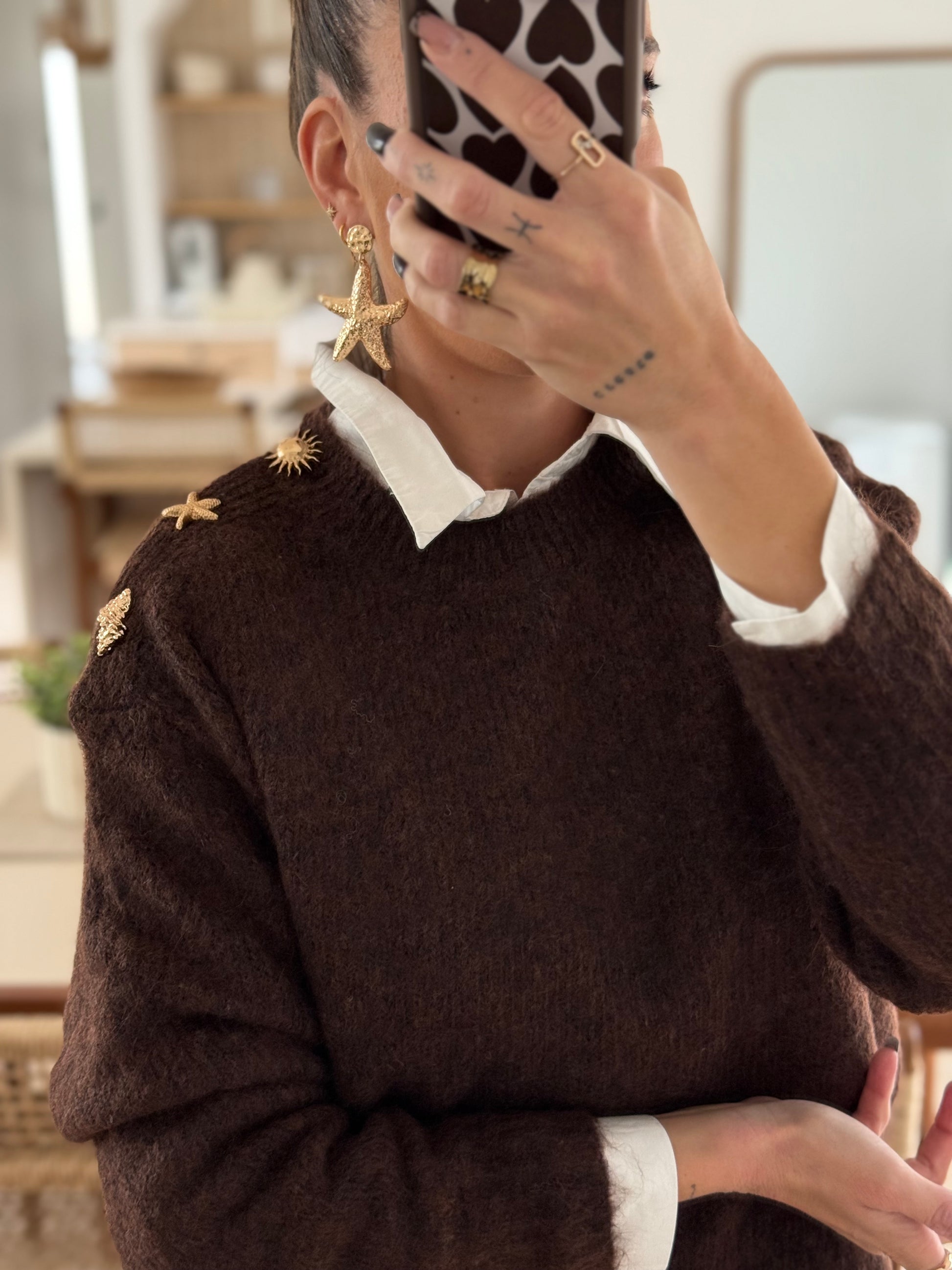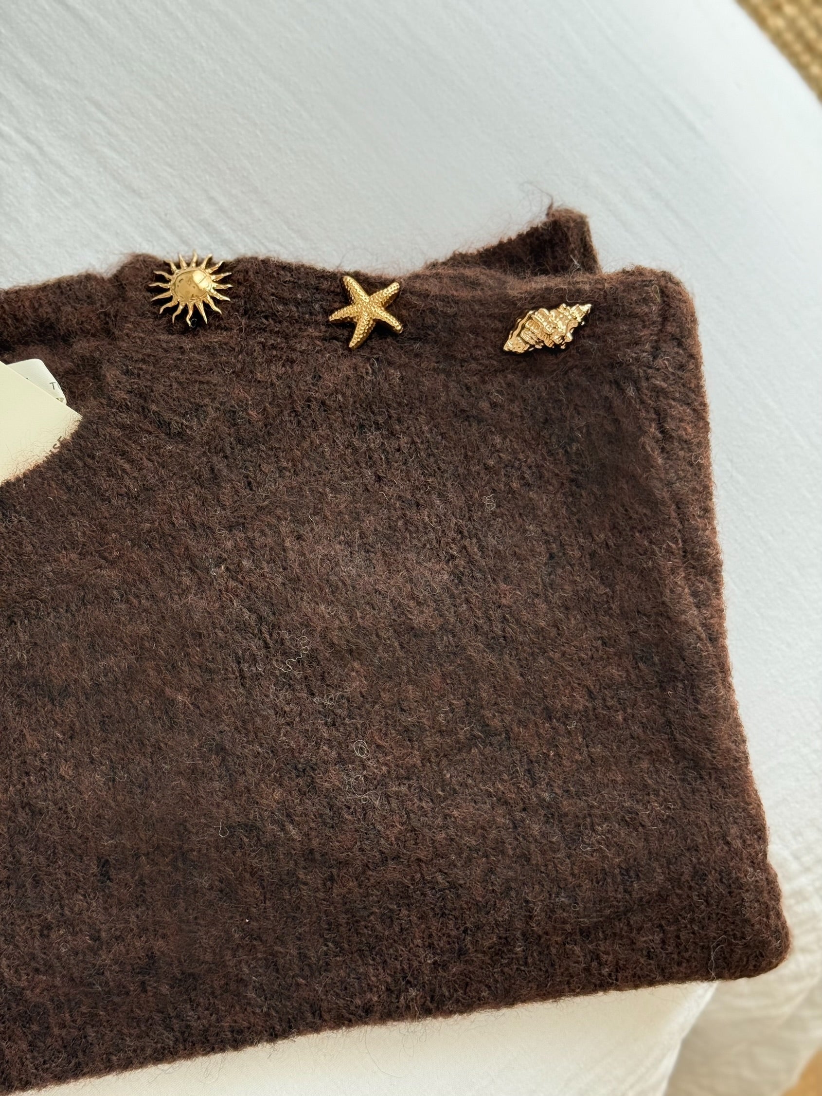 Lepull séduit par sa maille douce et moelleuse dans un brun profond, symbole d’élégance et de chaleur. Sur l’épaule, de délicats bijoux dorés en forme de soleil, d’étoile de mer et de coquillage viennent sublimer la silhouette et apporter une note raffinée et lumineuse.