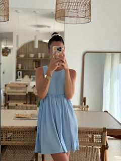 Son bleu ciel apaisant, sa matière fluide et son élastique à la taille qui souligne subtilement la silhouette en font une robe à la fois confortable, féminine et pleine de douceur.