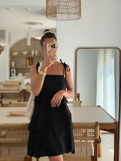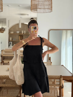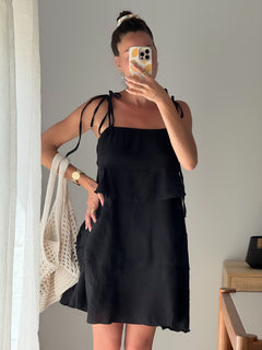 Mystérieuse, légère et libre. La robe CALVI est la pièce noire incontournable des beaux jours. Confectionnée en double gaze de coton, elle allie confort absolu et allure féminine.