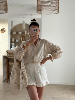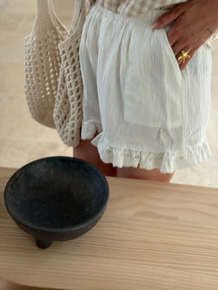 Le Short Candela est une pièce romantique et légère, parfaite pour l’été. Confectionné en double gaze de coton douce et aérée, il est sublimé par des broderies anglaises délicates sur le bas, apportant une touche bohème chic. Sa taille élastique assure confort et liberté de mouvement, que ce soit en ville ou en bord de mer.