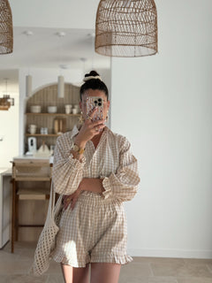 Le Short Dolce Vichy est un concentré de charme et de légèreté. Son imprimé vichy beige et blanc, sa coupe fluide et sa taille élastiquée en font une pièce confortable à souhait. Le détail des volants délicats en bas de jambes lui apporte une touche féminine et romantique irrésistible.