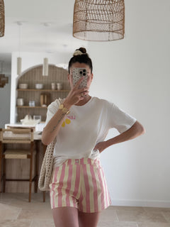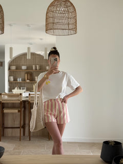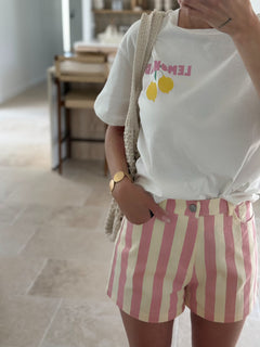 Le short Leïa allie élégance et confort avec ses rayures blanches verticales sur fond rose poudré. Léger et aérien, il capture l’esprit des journées ensoleillées et des moments de détente estivale. Sa coupe moderne et fluide se prête à une multitude de styles, de la tenue décontractée à celle plus sophistiquée, pour un look simple mais raffiné. Un incontournable de la saison pour toutes les amoureuses du style frais et lumineux !