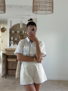Le Short Sole est le parfait allié de vos journées ensoleillées. Réalisé dans un mélange léger de coton et lin, il offre un confort absolu tout en gardant une allure élégante. Sa taille élastique flatte la silhouette et permet un ajustement parfait. Les finitions festonnées bleu roi ajoutent une touche artisanale raffinée, en harmonie avec la chemise Sole Amore.