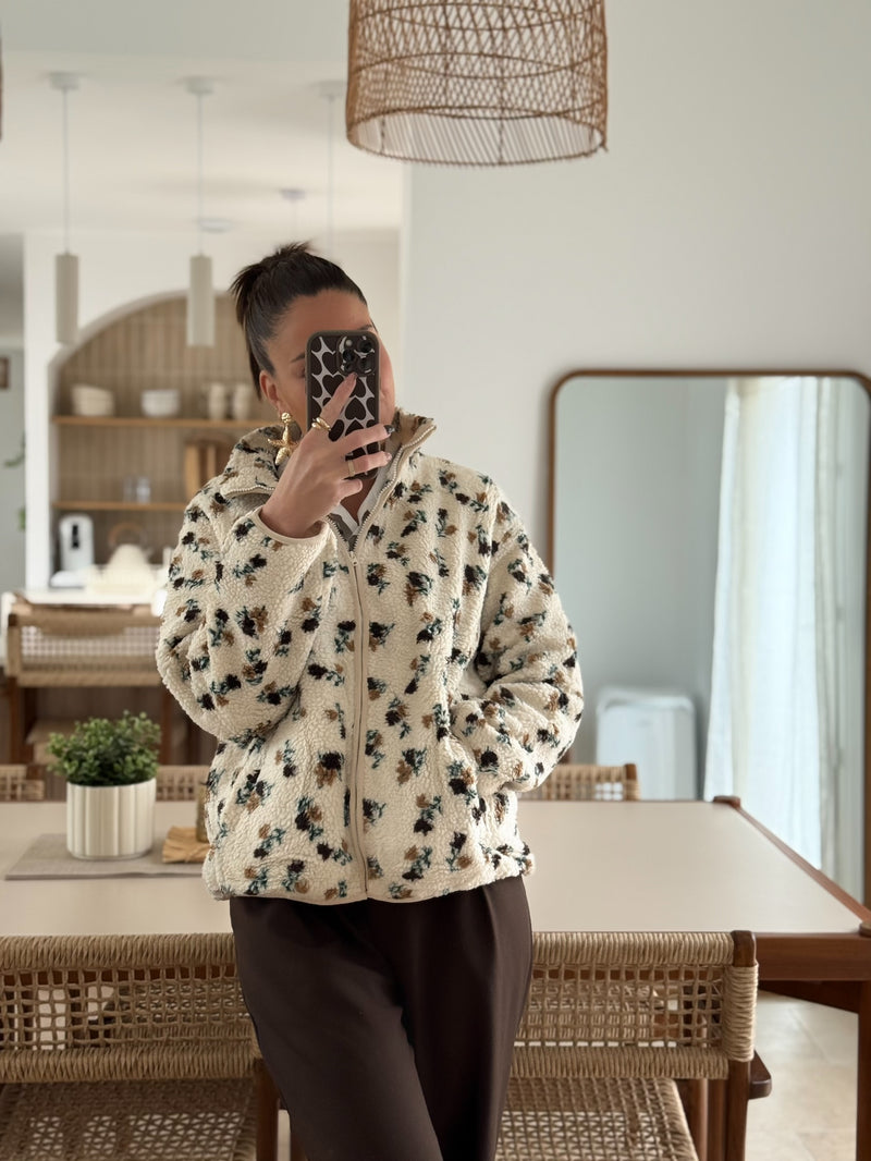 Sa matière effet moumoute d’un écru lumineux est sublimée par un motif floral délicat, mêlant des nuances de vert et de brun pour une touche naturelle et raffinée.